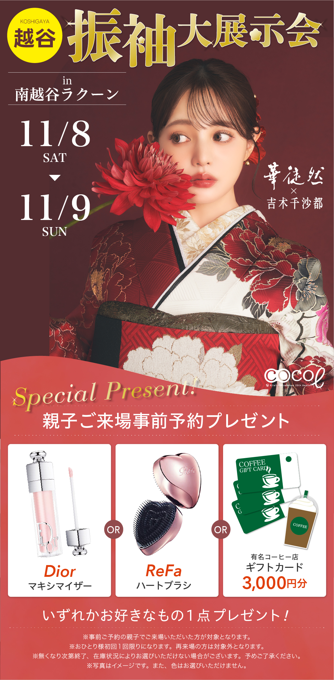 お問い合わせ先:振袖館ココル 南越谷駅前ラクーン店 TEL0120-924369 〒343-0845 埼玉県越谷市南越谷1-15-1 南越谷ラクーン5F ※定休日:火曜日・水曜日 ※本メールは送信専用となっております。キャンセルやお問い合わせの場合はお電話にてご連絡ください。